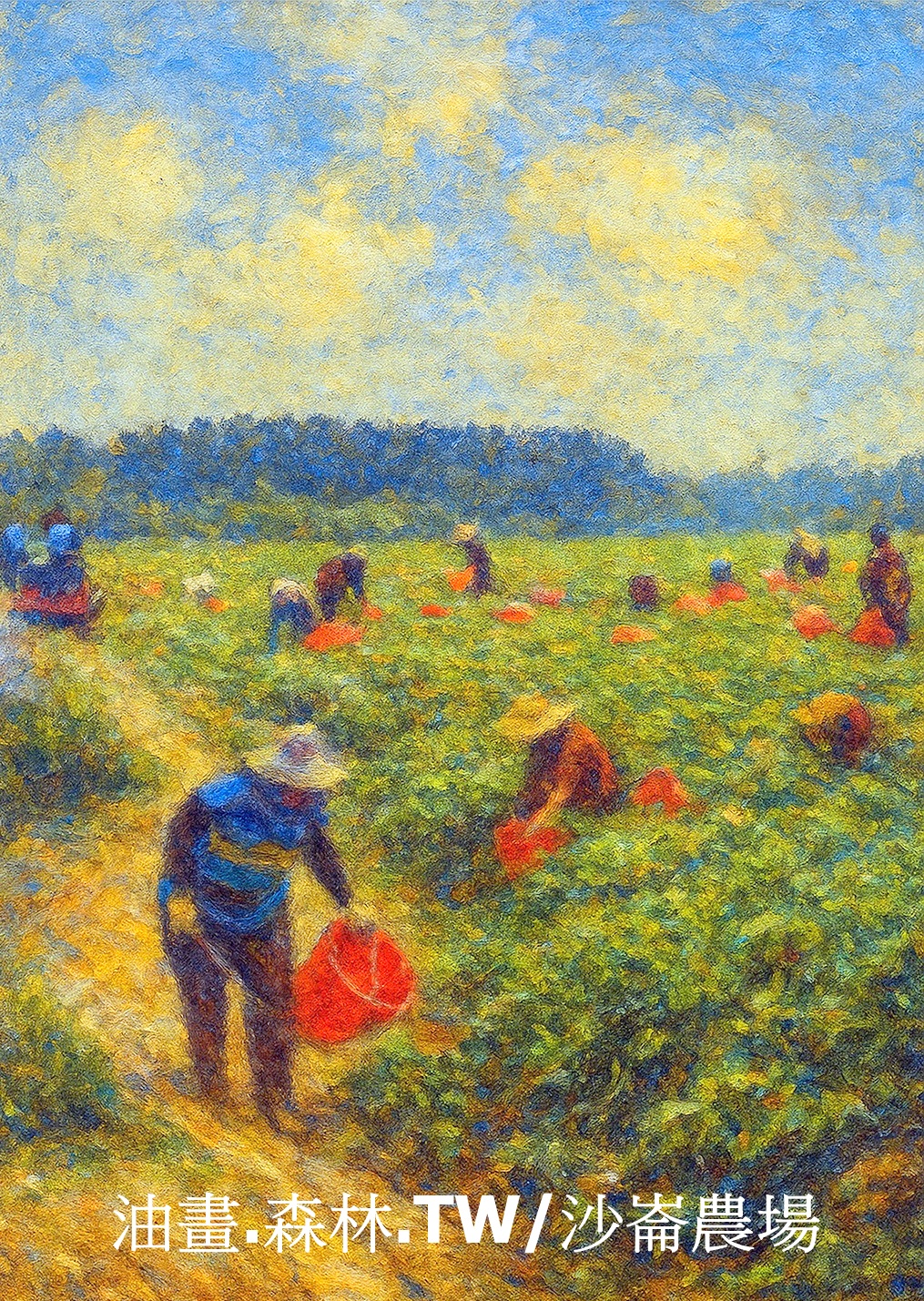 這幅畫不僅呈現了勞動之美,也讓自然景象化為數位時代的詩篇。