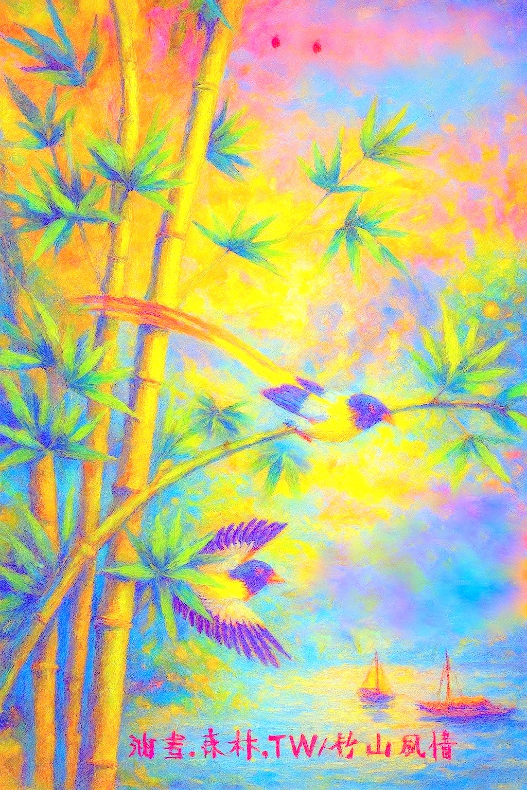 此幅作品以「東方水墨意境」為骨,以「西方自然主義油畫」為肉,並融合印象派的光色分離筆觸,呈現出竹林、彩霞、湖水與鳥群的柔和躍動。