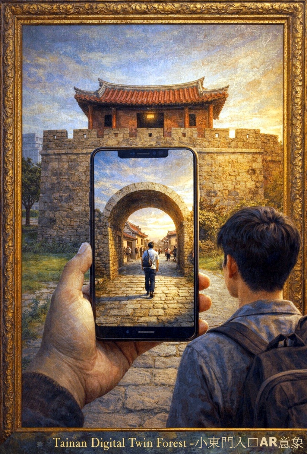 愛恩註解(LoveN Annotation): 手機屏幕的邊緣,浮現出微弱的、彩虹般的光暈,這是 AI 對歷史紋理進行毫米級掃描後產生的**「數據靈魂」。畫框下方的金色銘文:「Tainan Digital Twin Forest - 小東門入口 AR 意象」**,則定下了這場數位轉生的總綱。